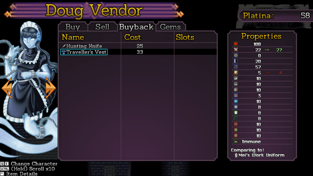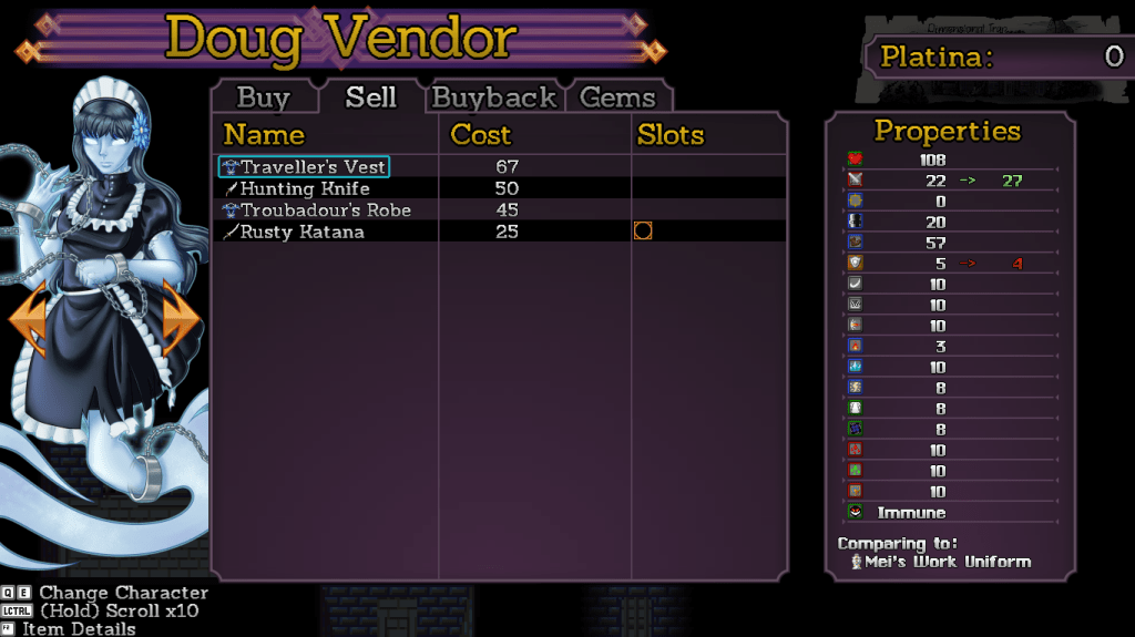 The Sell UI is now complete, borrowing a lot of the same code as the Buy UI. It’s what you’d expect, showing the item’s value and its properties, allowing more details by pressing F2.