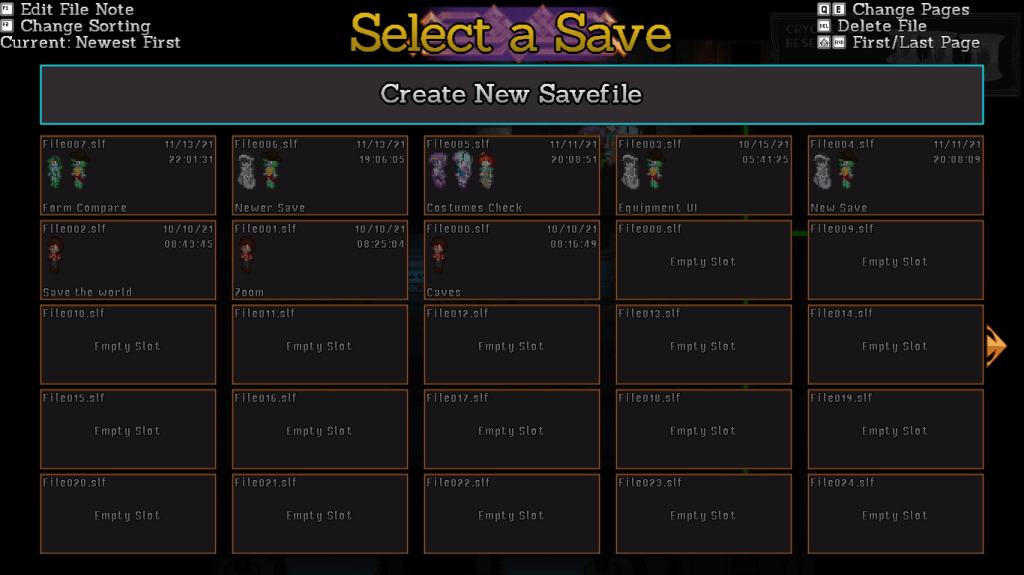 The Save UI is also updated to use a new set of fonts, and to standardized the control information printed at the top. You now also press the shoulder buttons to switch pages instead of holding Ctrl down.