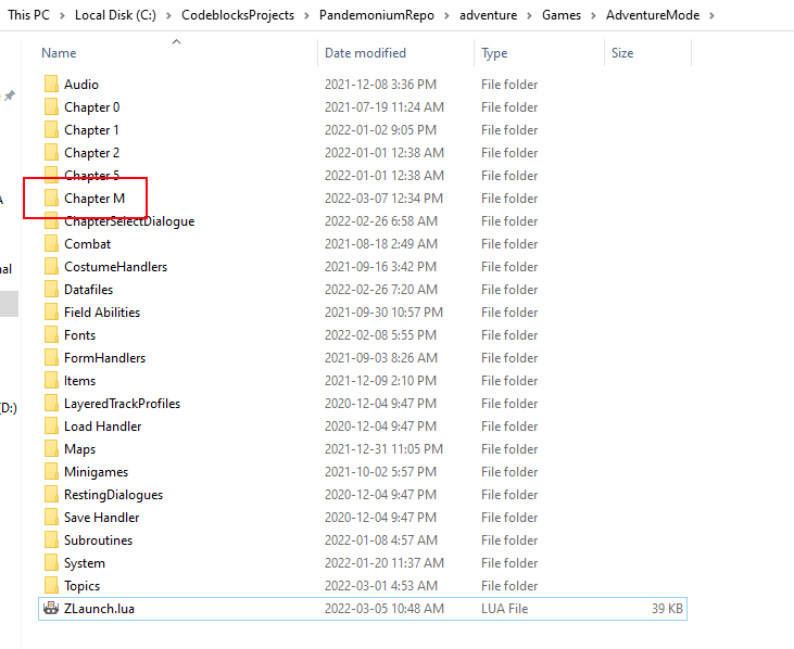 Download the modmaker’s kit, then unzip it so the Chapter M folder sits alongside the other chapter folders in Pandemonium/Games/AdventureMode/