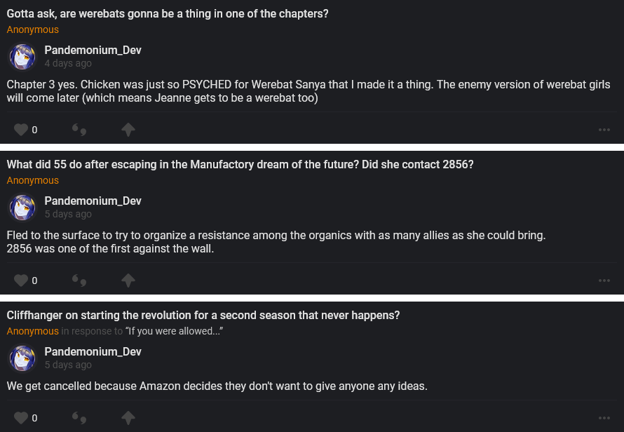 Bugfix releases are pushed pretty regularly as we clean things up, and new art or sprites gets added when it’s available. And then we work on the next update, and usually put up a patron poll to ask what you thought of the release and what features you want to see.