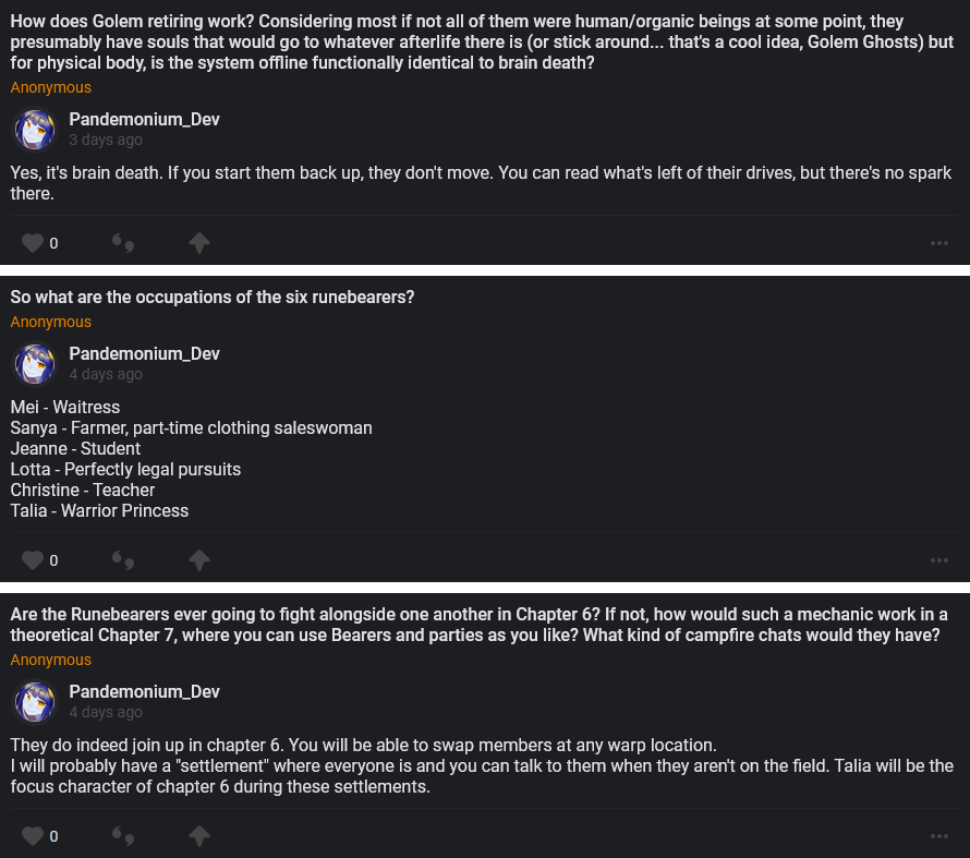 Therefore the upcoming plan is: Westwoods (Bunny, Empress, Harpy), Old Capital Grounds (Kitsune, Raptor), Ice Spires (we’ll do a vote on which subquests to do when we develop that) + Grappling Hook Trial, and then we’ll do another vote to pick what order we do the remaining subquests and minor areas.