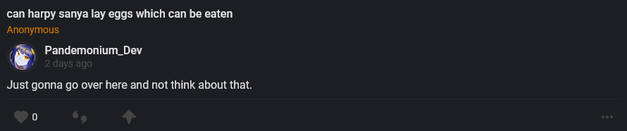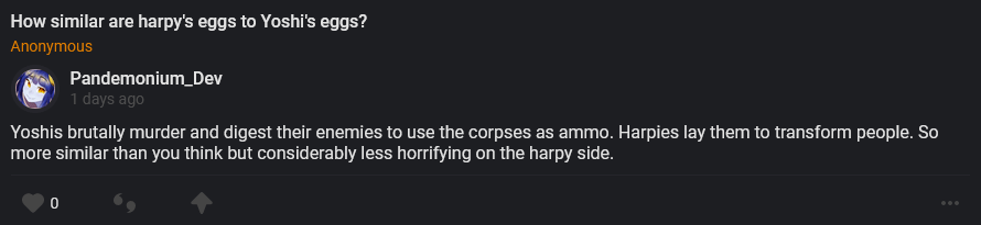 This means the next release may take some time, as the Harpy Tower Defense minigame will need to be made. I’m looking forward to it, but geez you guys always pick the most involved stuff.