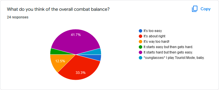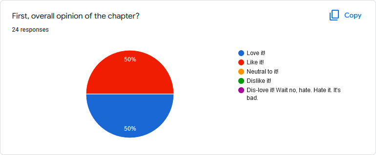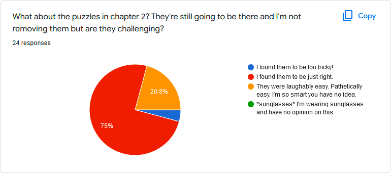 This poll was conducted with everyone who has played chapter 2 so far. Obviously there might be little itty bitty spoilers in it, so don’t read it if you’re going in totally blind.