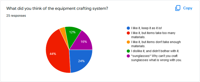 I will probably decrease materials requirements slightly. It should take some work and make you want to pick your items carefully, but not be so much that you don’t make forward progress.
