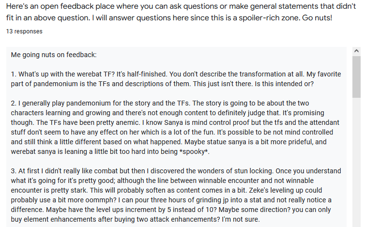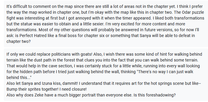 The big winner was the kitsune TF, but joke’s on you, the minigame for it is already in the game’s code! I already made it, ha ha ha! We might also see raptors in that release, but probably not Raelynn or the alraune story. That will come later.