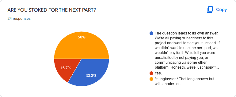 So that’s the general feedback, with a weird running gag that wormed its way into being canon. We do that a lot and do not apologize.