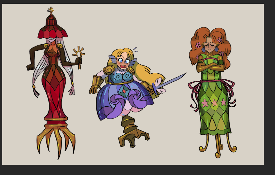 Chicmonster has finished sketching ALL of the enemies and bosses, and has sketched about half of the player forms. I asked her to get me some finished pieces to show off for this milestone, so here we are: