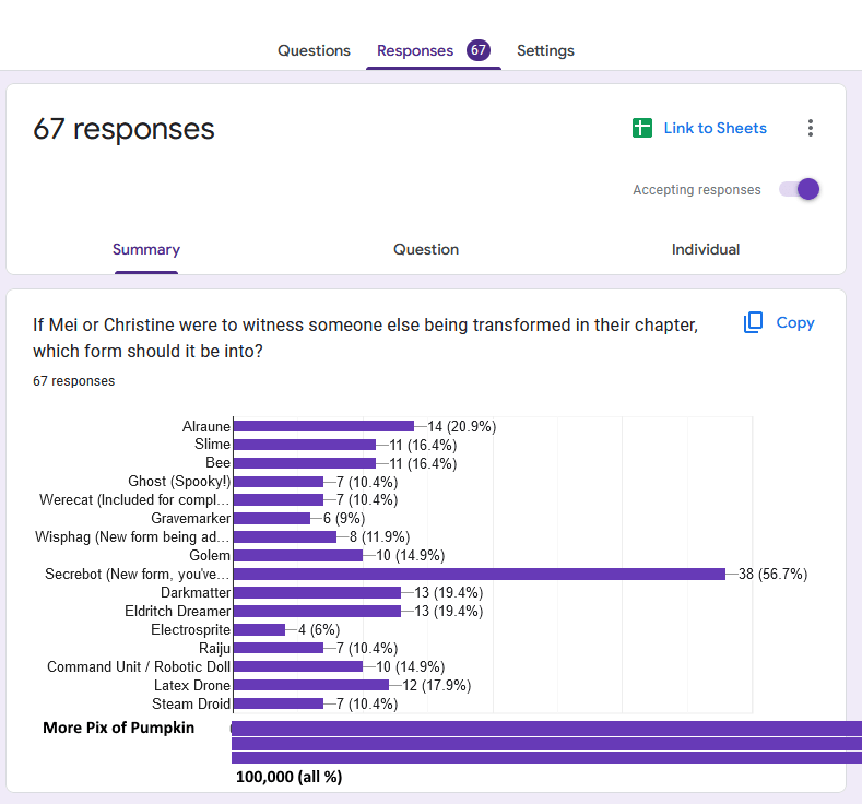 Wow I think the democratic response to the poll question is overwhelming. People want Pumpkin.