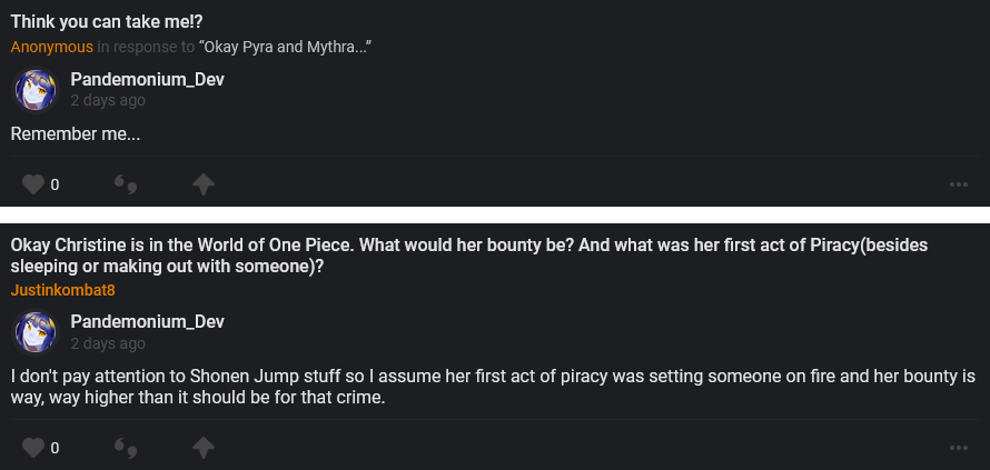 We had our monthly team meeting today, and things are going shockingly well. I need 2 or 3 more sprite sheets and I will have all the art I need for chapter 1’s update. As such we discussed plans for the chapter 5 update. I was thinking we’d finish 55’s Sundress costume and possibly give SX-399 a costume since she needs some love, on top of getting the new TF for Christine of course.
