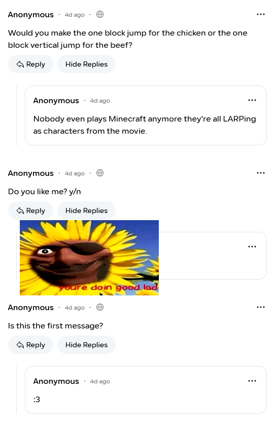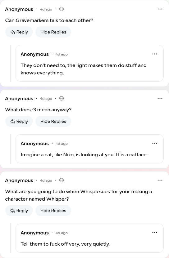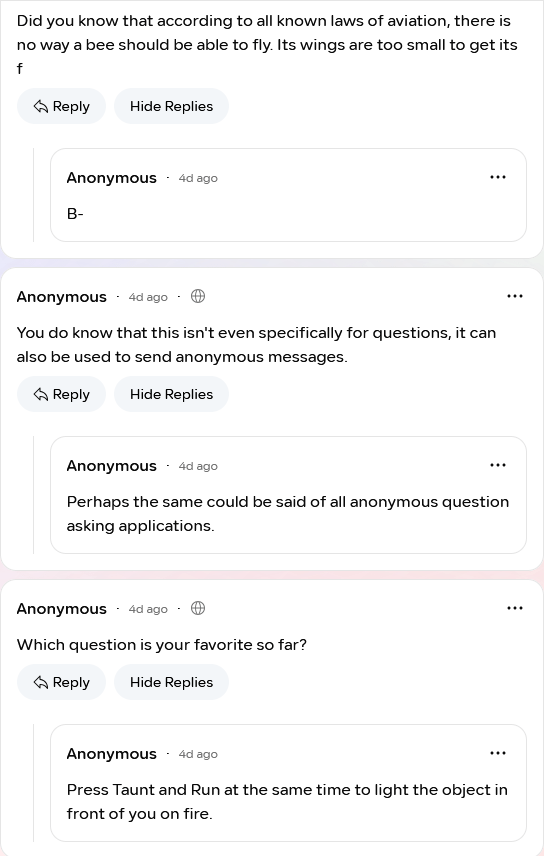 Curiouscat is dead so now it’s time to move on. We will now accept anonymous questions from Whispa, a site that seems to have been built for a different purpose but whatever. The other ones I tried didn’t even work half the time for non-obvious reasons.