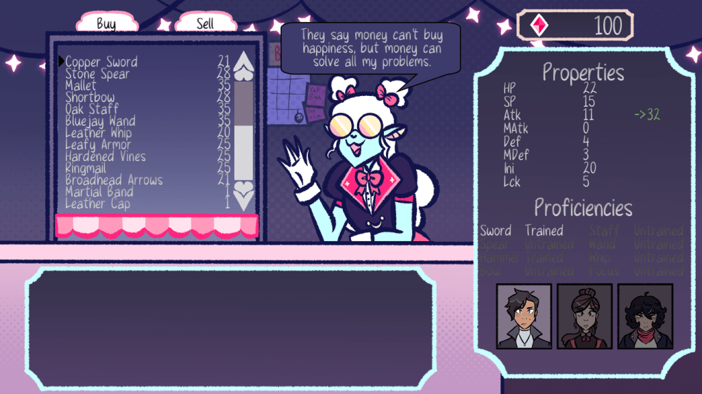 Fluffs has a bunch of silly quotes and will mock you if you can’t afford something. With that, I believe everything except the title screen is done. Title might not get a big improvement until after the prototype.