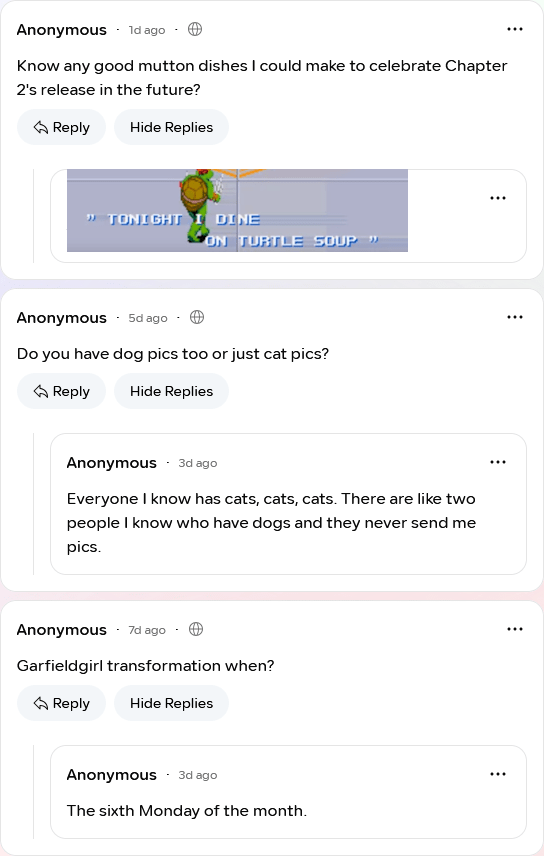 You can ask us anonymous question on Whisp.sh. If you’ve ever wanted to get smarmy answers to questions, or just know more lore, that’s the place!