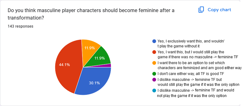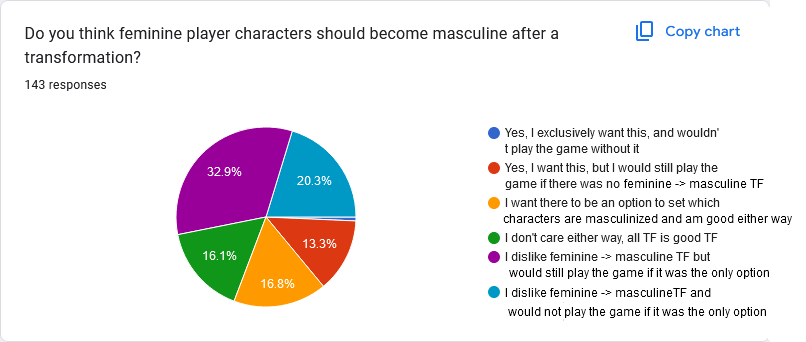 The distribution is different for FtM. First and most obvious the number of people who wouldn’t play the game at all is far lower, and the dislike margin is bigger. If the game was exclusively FtM we’d lose 20% of the audience, whereas it was under 1% for the MtF crowd.