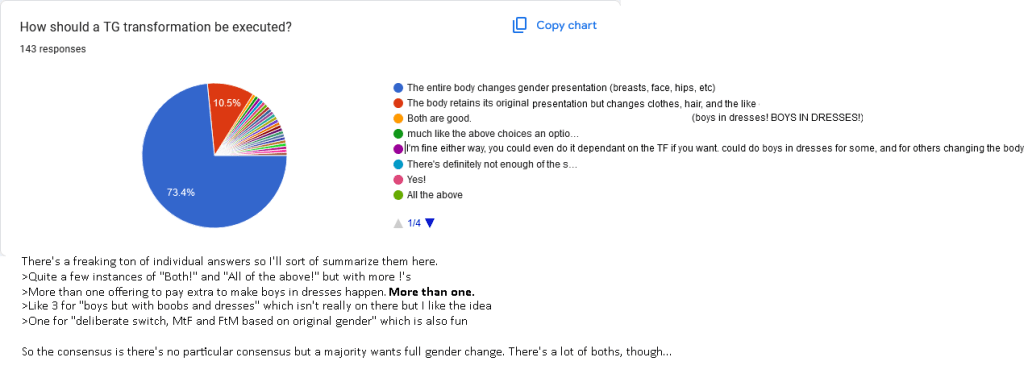 Anyway, there are two takeaways here: First, a lot of people like it when the entire body changes and not just clothes and whatnot, and the second is that a sizeable number like both. Not all of the “other” picks were “both” but I would estimate it’s about equal to the red block (Boys in dresses).