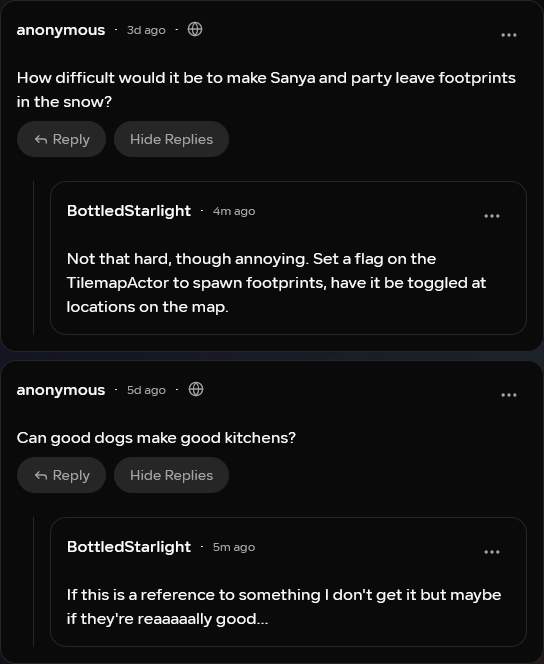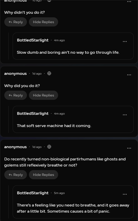 You can ask us anonymous question on Whisp.sh. If you’ve ever wanted to get smarmy answers to questions, or just know more lore, that’s the place!