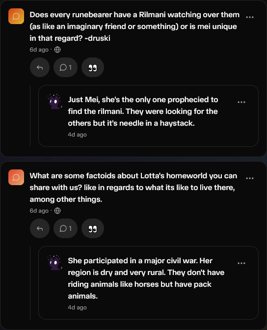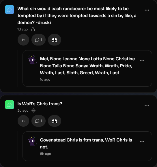 You can ask us anonymous question on Whisp.sh. If you’ve ever wanted to get smarmy answers to questions, or just know more lore, that’s the place!