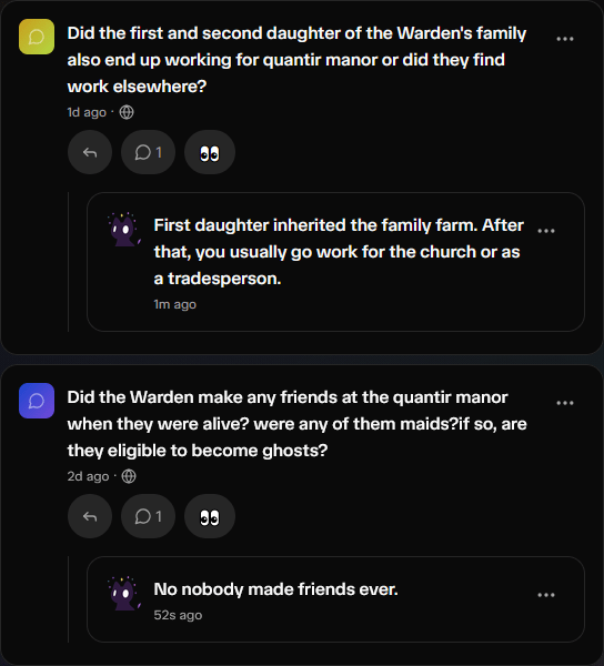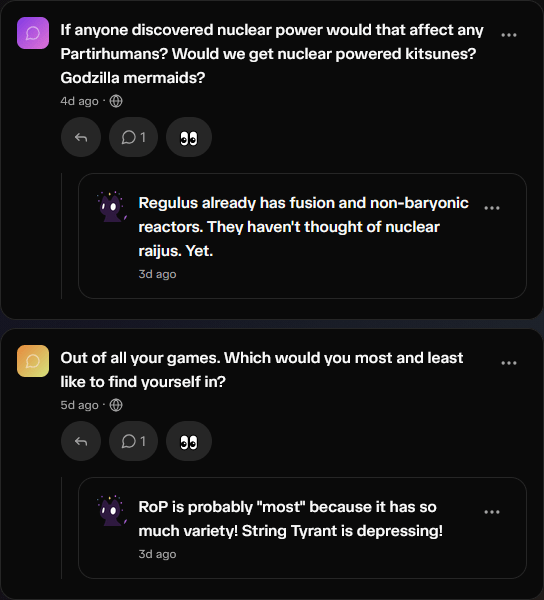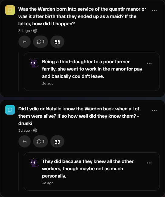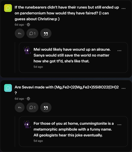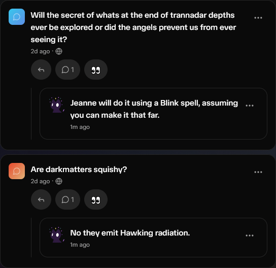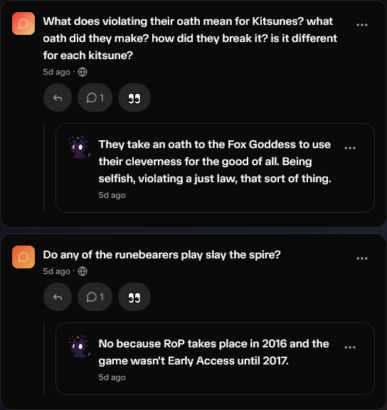 You can ask us anonymous question on Whisp.sh. If you’ve ever wanted to get smarmy answers to questions, or just know more lore, that’s the place!