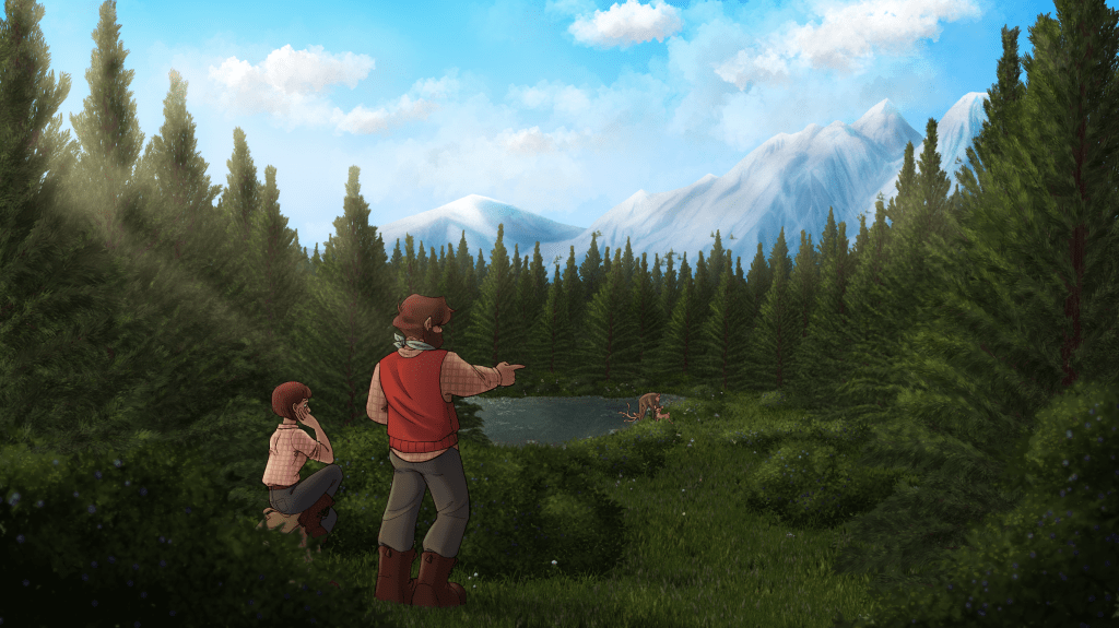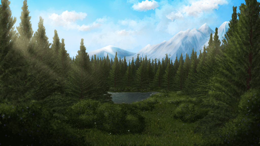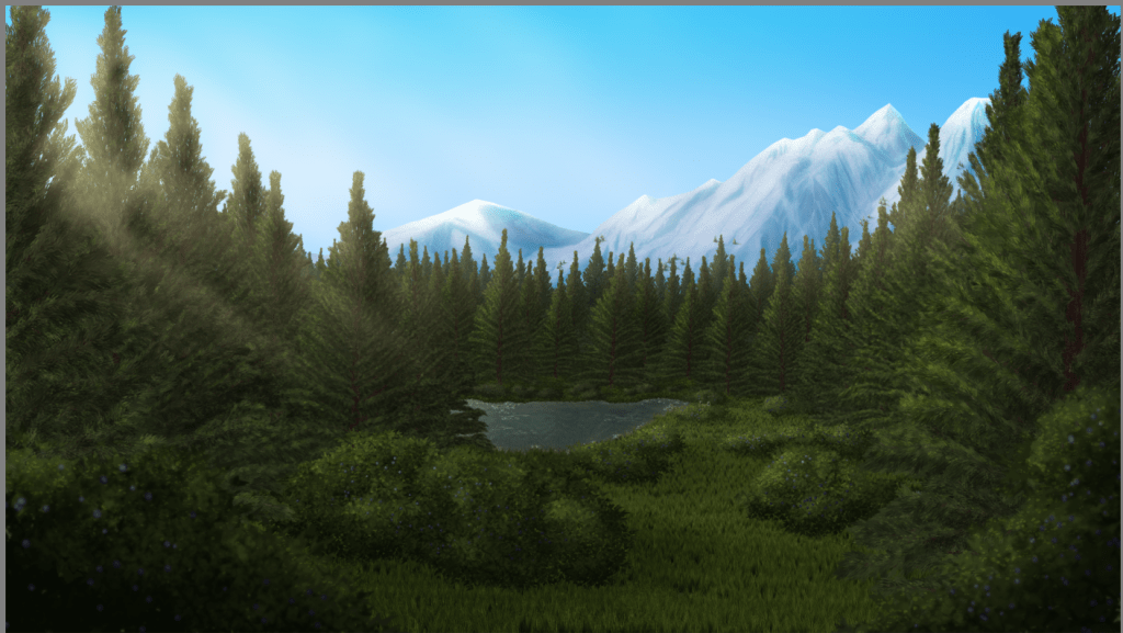 Buuut.. I did promise to collect some in-between pictures of my work process for this update, so here we go.. I picked 2 works for this, the “Alpine Hunting” background and the big worldmap. These are rough preview screengrabs I made at the time I finished them, and if you ever wondered where I got my tree brushes from.. I make those fuckers myself. The workfile for the treebrush itself is almost 10 times the size of the picture the treebrush got used in. This happens constantly because I have an unhealthy obsession with details and despite what Bob Ross told me, trees really aren’t that easy after all. 😀