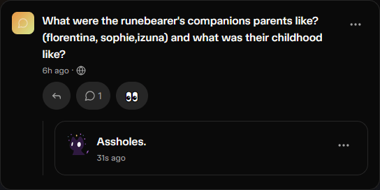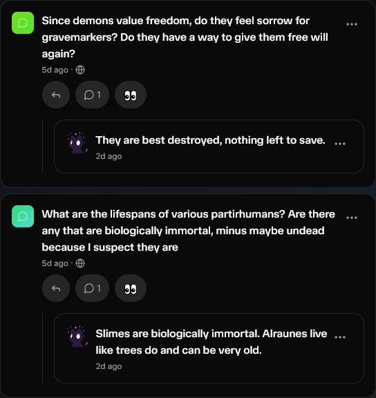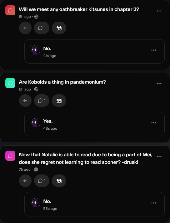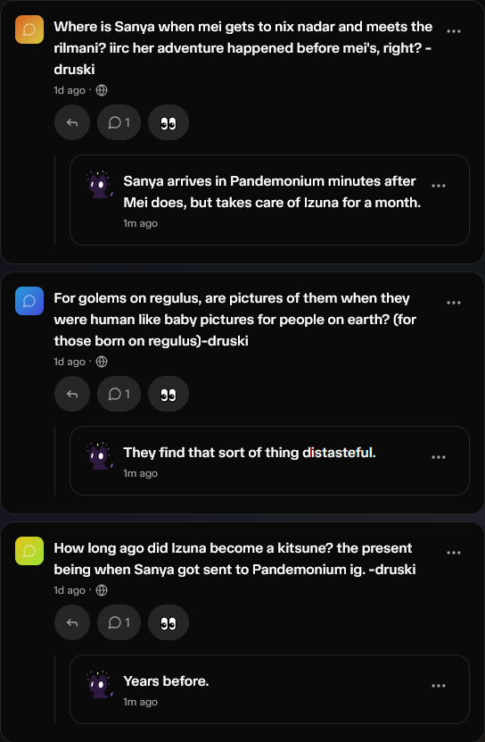 You can ask us anonymous question on Whisp.sh. If you’ve ever wanted to get smarmy answers to questions, or just know more lore, that’s the place!