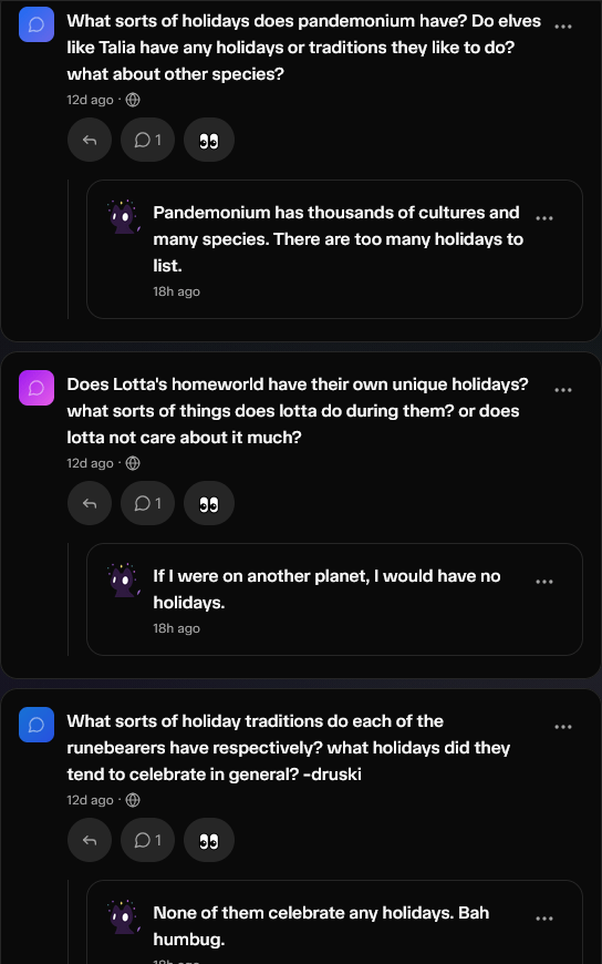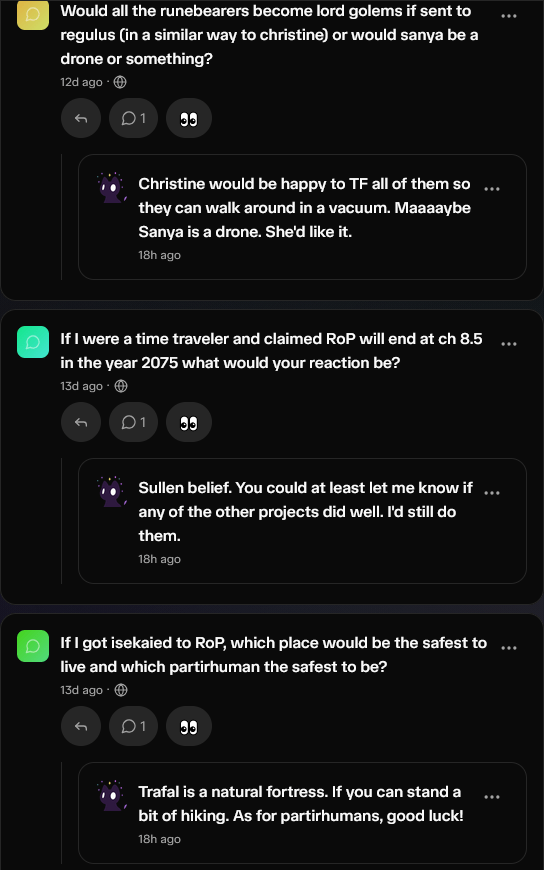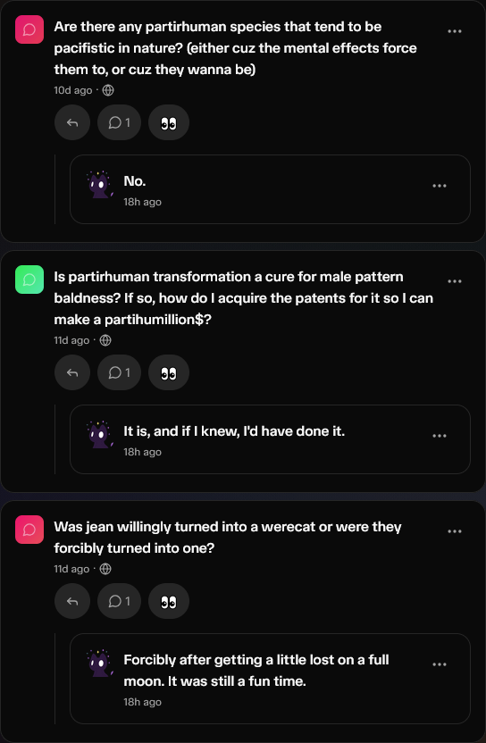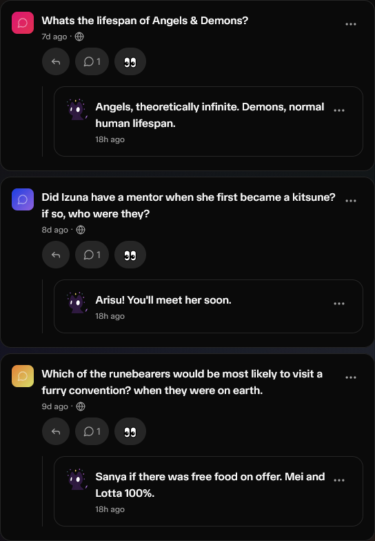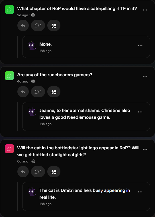 You can ask us anonymous question on Whisp.sh. If you’ve ever wanted to get smarmy answers to questions, or just know more lore, that’s the place!