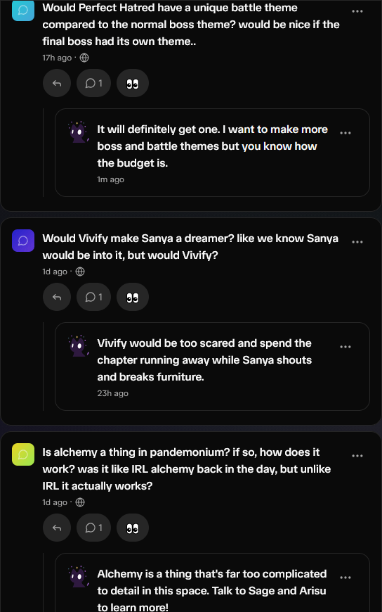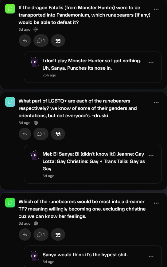 You can ask us anonymous question on Whisp.sh. If you’ve ever wanted to get smarmy answers to questions, or just know more lore, that’s the place!