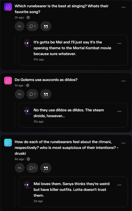 You can ask us anonymous question on Whisp.sh. If you’ve ever wanted to get smarmy answers to questions, or just know more lore, that’s the place!