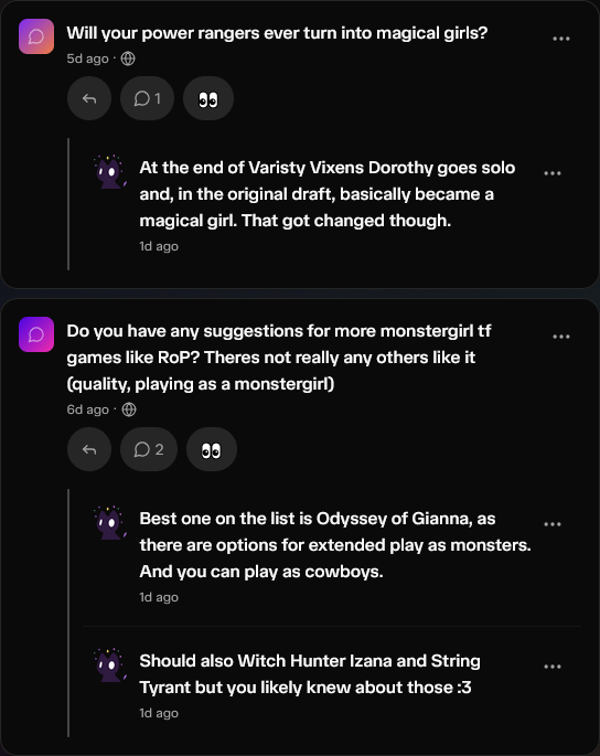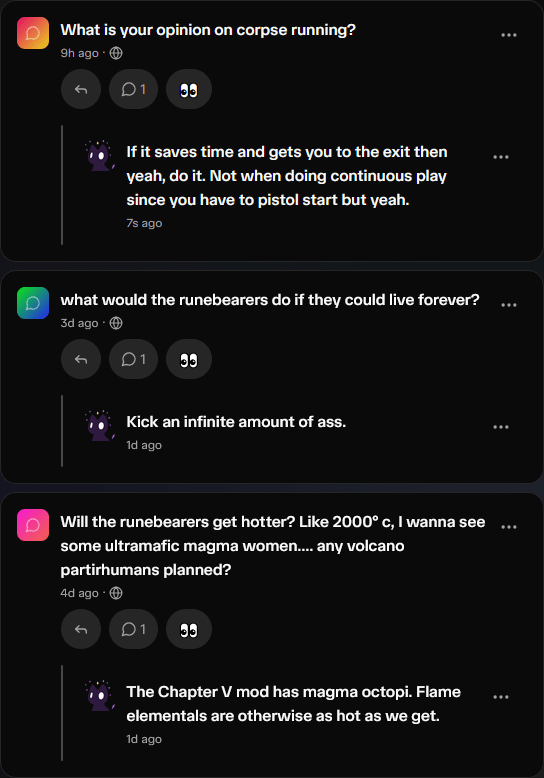You can ask us anonymous question on Whisp.sh. If you’ve ever wanted to get smarmy answers to questions, or just know more lore, that’s the place!