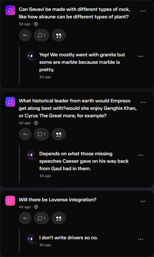 You can ask us anonymous question on Whisp.sh. If you’ve ever wanted to get smarmy answers to questions, or just know more lore, that’s the place!