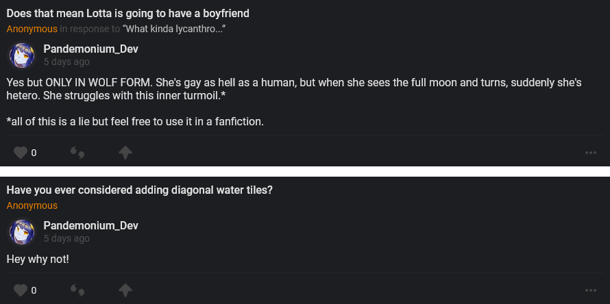 As you can probably guess from the changelogs, I’m now working on the chapter 5 update, getting the bugs out of the way before I start the new stuff. It will be a few more weeks of these before I have to start making the new quests and NPCs so there will be several more public patches before things go back to being supporter-only for a month.
