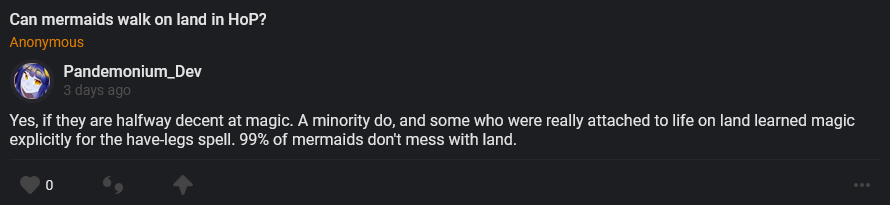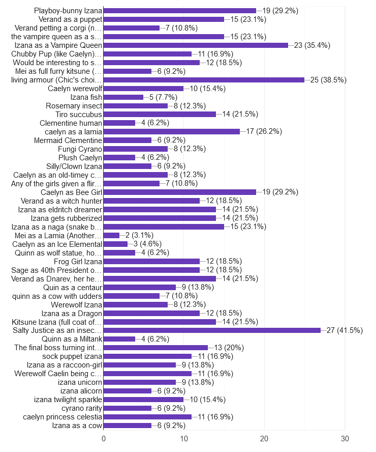This means that – me as an insect girl won. Yes, really. I am technically a character in the game because I appear in the end credits, but how did that actually win? So I will be PERSONALLY commissioning Chic to draw the second place winner, Living Armor, because the other 1000 people who played the game and don’t care about our weird in-jokes will want to see a WHI thing and not my own vanity project even though it’s not a damn vanity project, YOU voted for it.