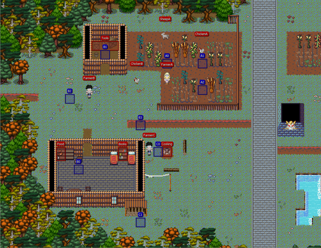 I’ve found a system that mostly works for me, there is always a tradeoff between simplicity of the code and flexibility to make more advanced scenes and NPCs. The sheep and chicken NPCs are spawned and set to wander around, no biggie there. The farmer NPCs are spawned, but also create a parallel script. Whenever you walk across a trigger or examine something, a script is called, but this script stops gameplay. Parallel scripts run but don’t stop gameplay, allowing NPCs to walk around as though they are controlled by a cutscene. These constructors just specify which farmer uses which script.