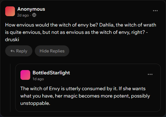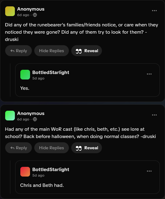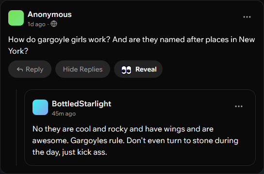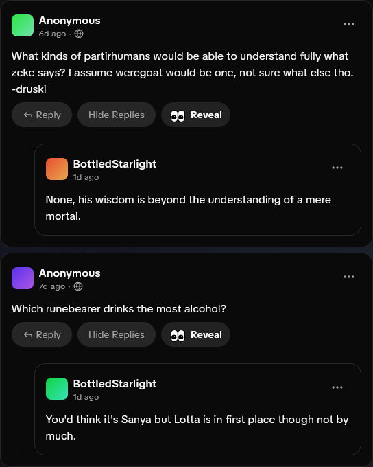 You can ask us anonymous question on Whisp.sh. If you’ve ever wanted to get smarmy answers to questions, or just know more lore, that’s the place!