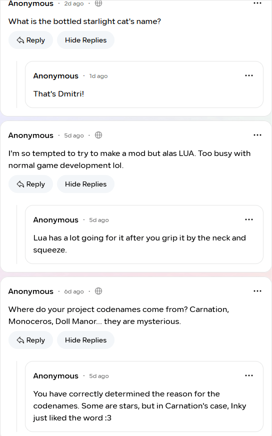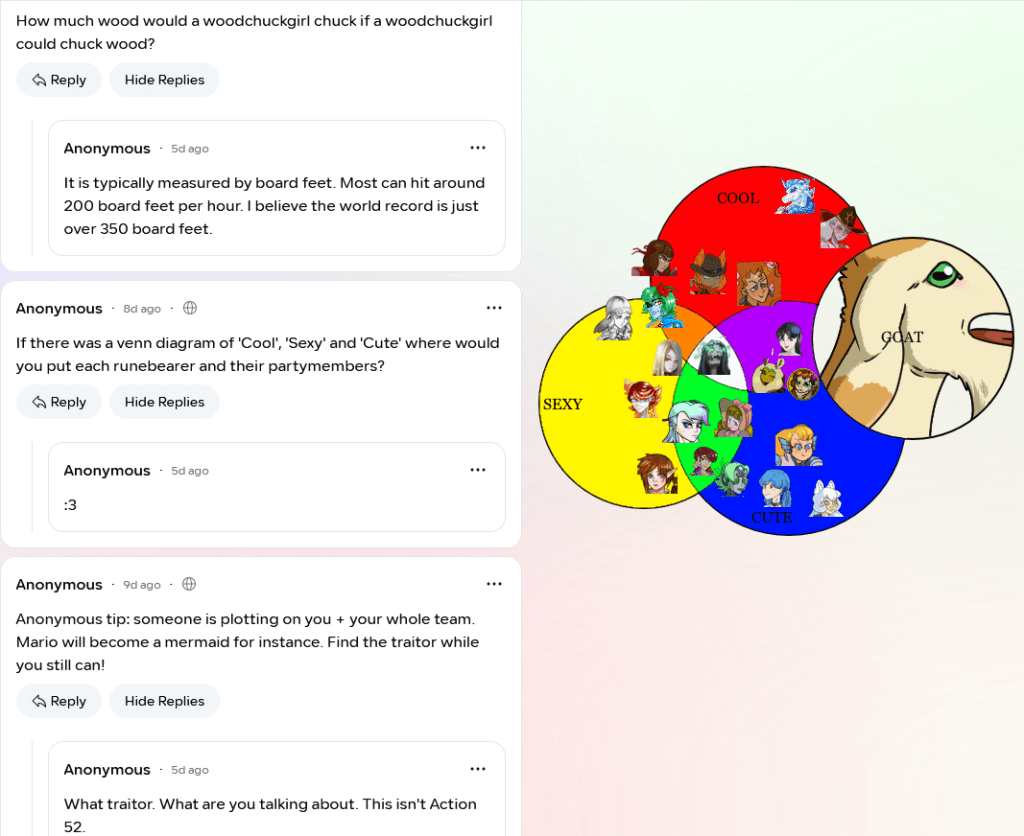 You can ask us anonymous question on Whisp.sh. If you’ve ever wanted to get smarmy answers to questions, or just know more lore, that’s the place!