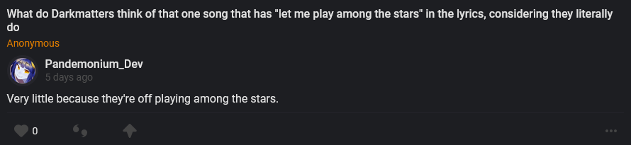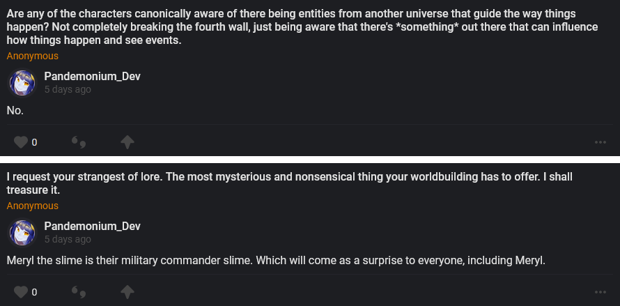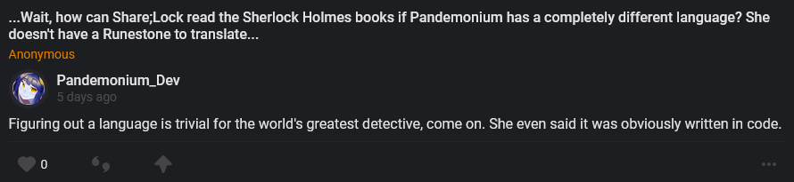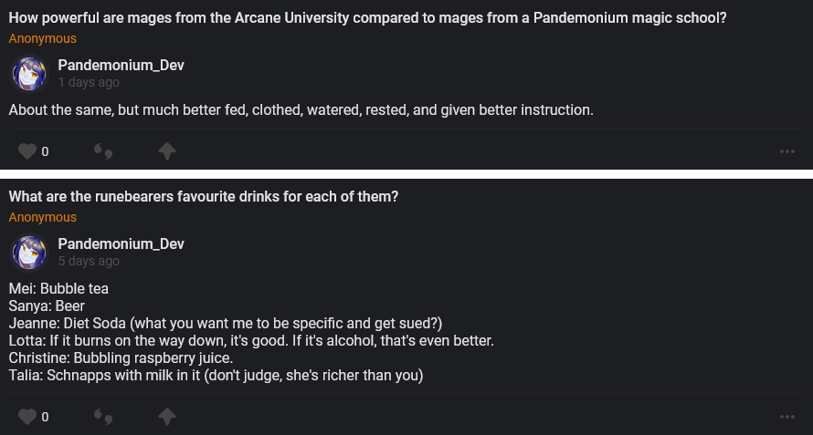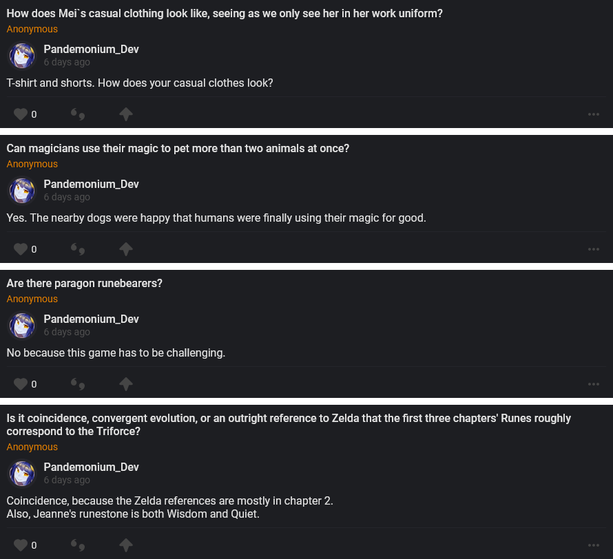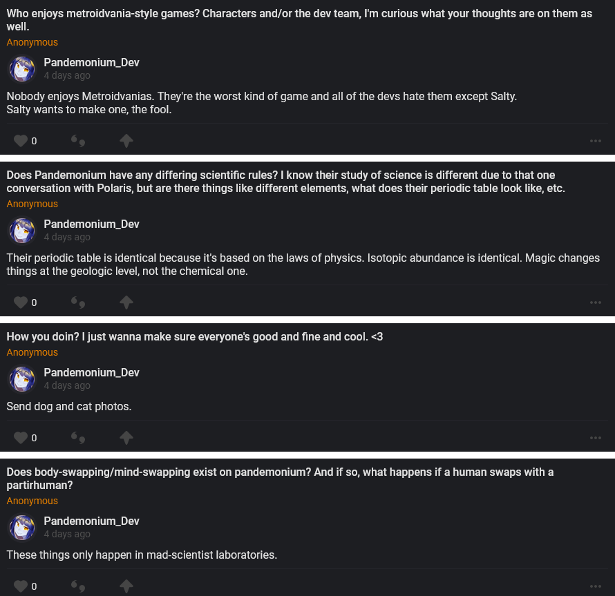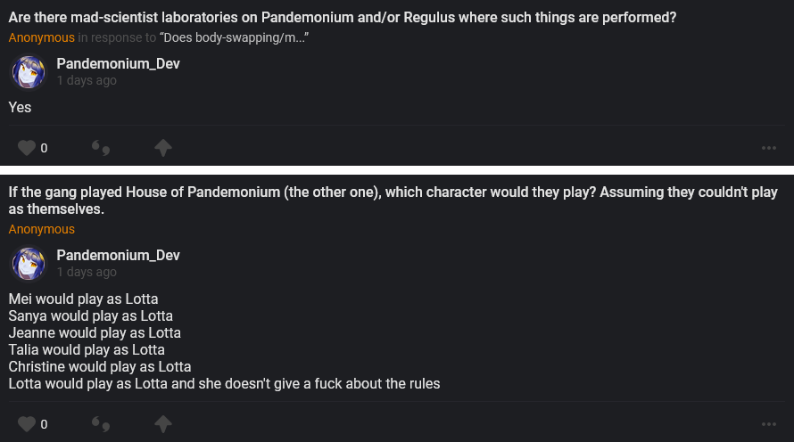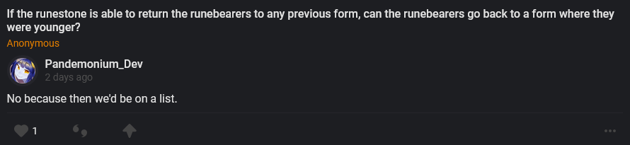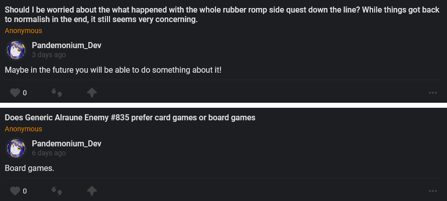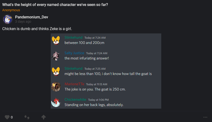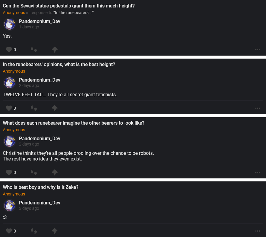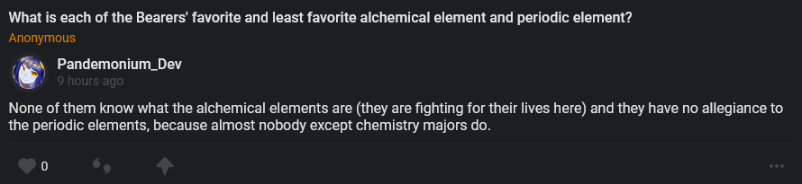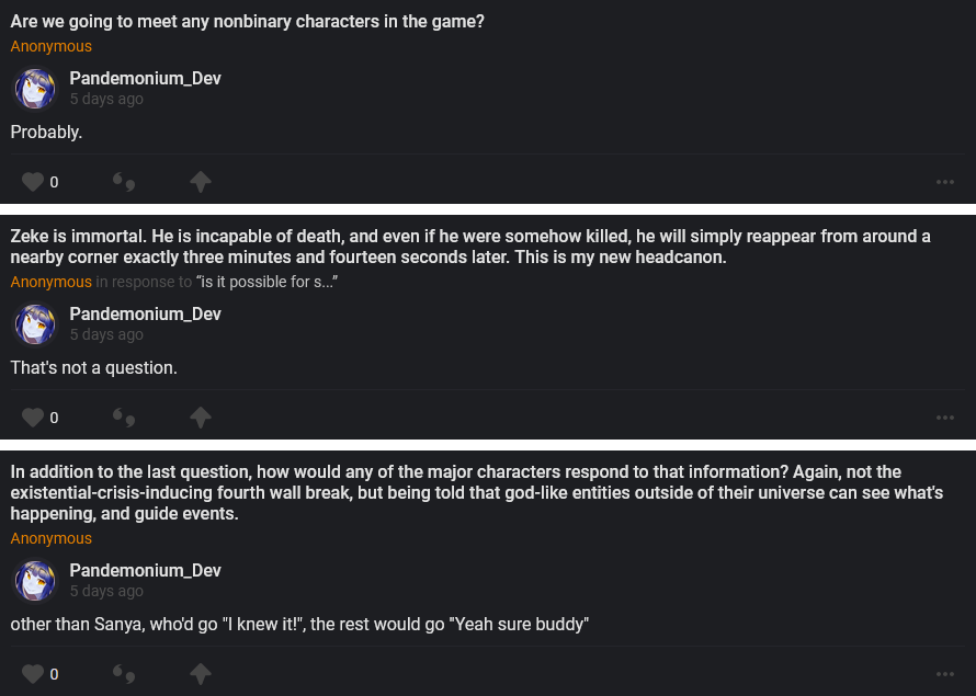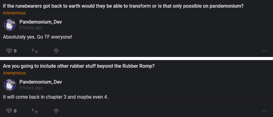 As a head’s up, I would like everyone to know to Please Not Ask About Chapter 2 Stuff On Curious Cat until 1 month has passed. Some people don’t want to get spoiled! You can instead use our Discord or the TFGS forums, where you can spoiler posts. Links are in the links pile at the bottom of every post!