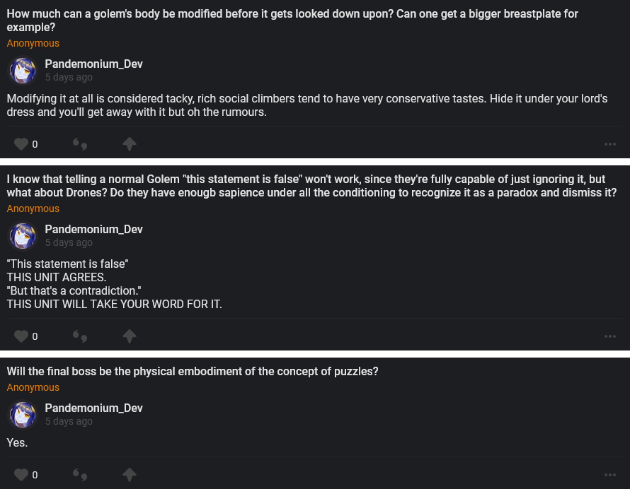 Therefore the upcoming plan is: Westwoods (Bunny, Empress, Harpy), Old Capital Grounds (Kitsune, Raptor), Ice Spires (we’ll do a vote on which subquests to do when we develop that) + Grappling Hook Trial, and then we’ll do another vote to pick what order we do the remaining subquests and minor areas.