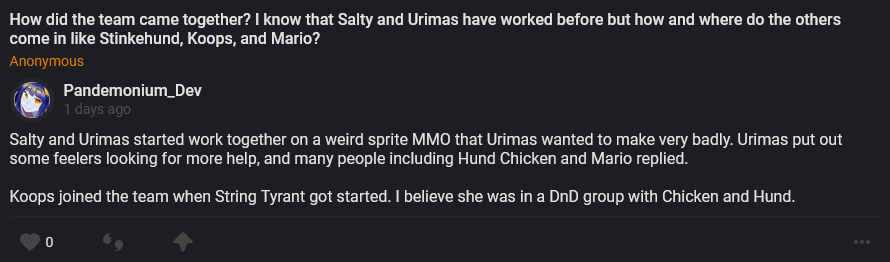 I spent most of the week fixing bugs, wow who would have thought. Chicken is designing a new character (patrons get to see her today!), Koops is designing a new character (patrons get to see her next week!), Urimas… made some sprites but mostly did his own thing. Hund, who can say?