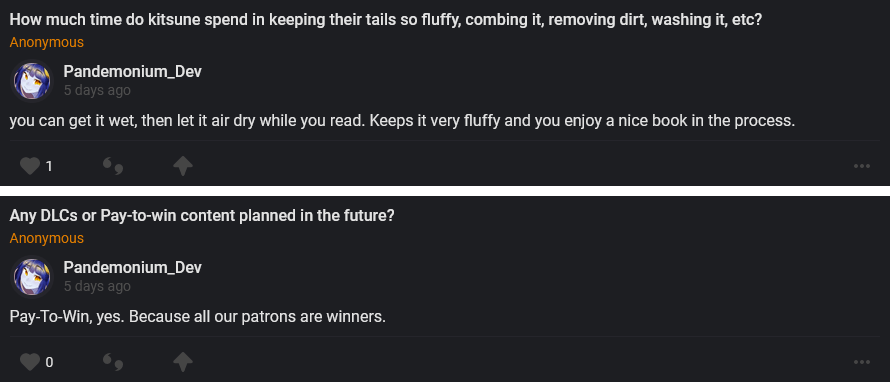 Bugfix releases are pushed pretty regularly as we clean things up, and new art or sprites gets added when it’s available. And then we work on the next update, and usually put up a patron poll to ask what you thought of the release and what features you want to see.