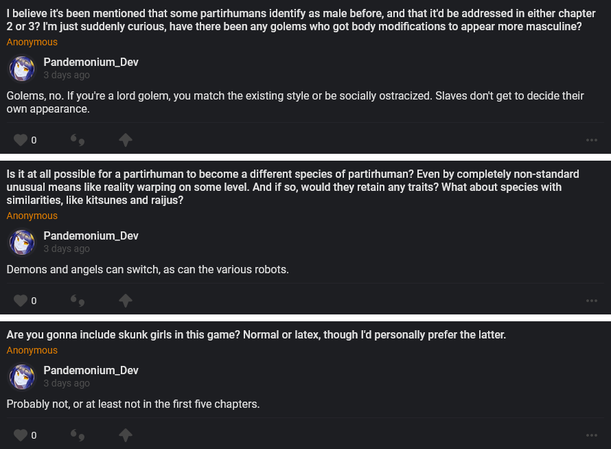 The big winner was the kitsune TF, but joke’s on you, the minigame for it is already in the game’s code! I already made it, ha ha ha! We might also see raptors in that release, but probably not Raelynn or the alraune story. That will come later.