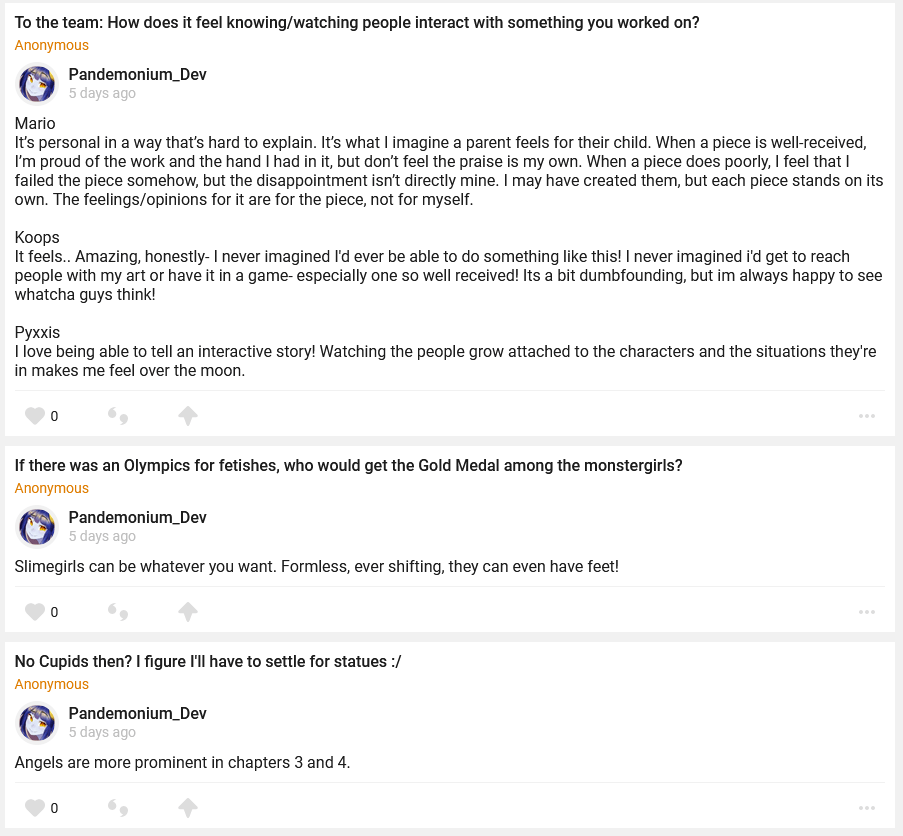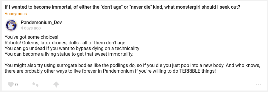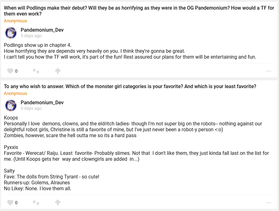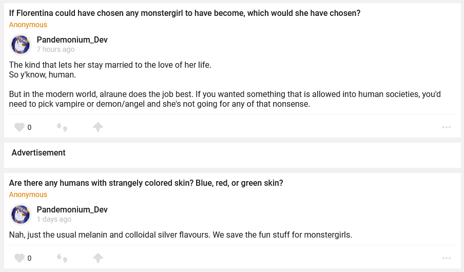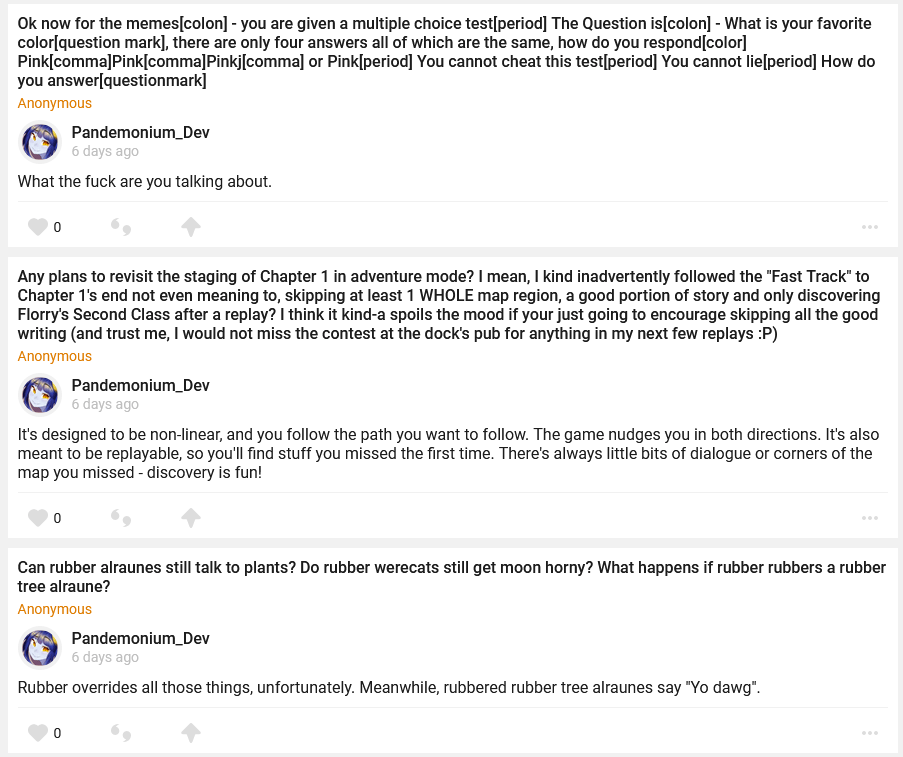 //–Minor *Added all remaining standard keyboard key images so you won’t see “ERROR” all over the place. *Added Zombee relive scene. *Added Alraune Volunteer relive scene. *You can attempt to boop the statue at Polaris’ house for the corgi boop paper. *You can now try to lockpick the sister superior’s door in the Dimensional Trap Basement. *Stun and stun resistance now appears in the combat inspector. *Added some more dialogue topics.