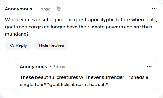 You can ask us anonymous question on Whisp.sh. If you’ve ever wanted to get smarmy answers to questions, or just know more lore, that’s the place!